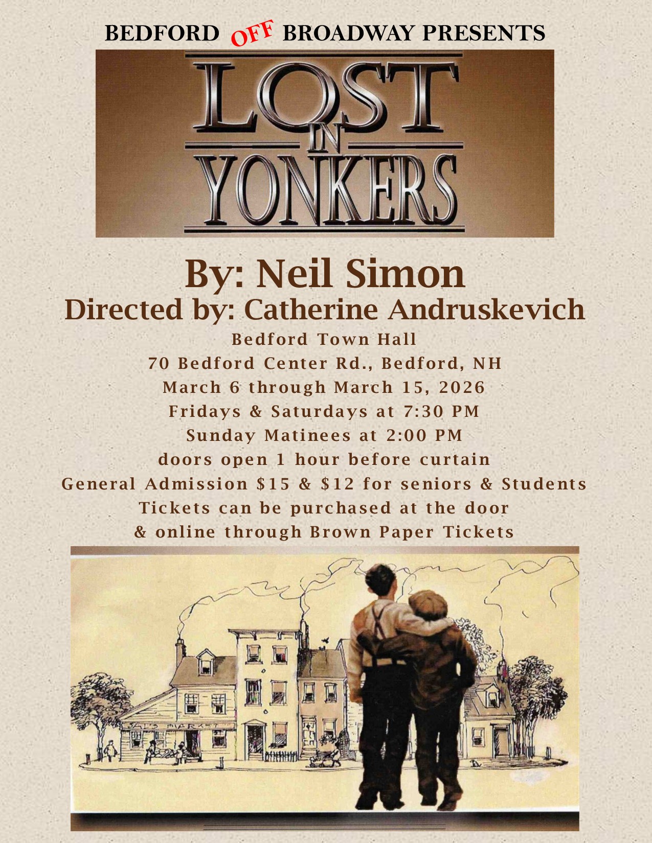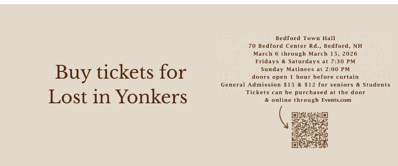 Starting Times: Fri & Sat 7:30pm Sundays 2pm Bedford Off Broadway (a NH non-profit Community Theater Company) is happy to announce auditions for their 2026 winter show "Lost in Yonkers" written by Neil Simon have been completed. The play will be directed by Catherine Andruskevich and stage managed by Pat Napolitano. "Lost in Yonkers" delves into themes of family, love, loss, and resilience. The characters are richly developed, showcasing the complexities of familial relationships. Grandma Kurnitz embodies tough love, having built a protective shell around herself due to her past traumas. The play highlights the struggles of each character, particularly the boys, as they learn valuable life lessons about responsibility and the importance of family bonds. Characters: JAY, 15 & ARTY, 13, Jay's brother. The boys are well behaved for their father and get along with each other. Sort of Wally and Beaver. EDDIE, 40s, the boys' father in desperate financial difficulties seeking Grandma's help with the boys. BELLA, mid-30s, the boys' aunt; childlike developmentally, but not childish, sweet and excitable. GRANDMA to the boys, 70s, angry old woman, very stern and unyielding. LOUIE, 30-40s, the boy’s uncle, secretive, probably on the run from the mob. GERT, late 30s, the boy’s aunt, sweet and likeable but with an unusual speech "tick", likely psychosomatic. Please contact Catherine (cathandrus@gmail.com) with any questions or concerns. Lost In Yonkers by Neil Simon Winter-3/6/26 through 3/15/26 During the 1940s, Jay and Arty find their lives turned upside down when their father moves south for work, leaving them with their no-nonsense grandmother and their loving but absent-minded spinster aunt, Bella. Love . . . Or Best Offer by Phil Olsen Spring-6/5/26 through 6/14/26 Meet Cheryl, who's been a widow for two years and Stan, the fresh divorcee. Their friends Lori and Dave, seeing their struggles with awful blind dates, decide it's time for a digital dating intervention. That's when they all dive into the crazy world of "Friends, Love, or Whatever," a new dating website for the "over 50" club. Crimes of the Heart by Beth Henley 11/6/26 through 11/15/26 The tragicomedy relates the story of the three Magrath sisters, Meg, Babe, and Lenny, who reunite at Old Granddaddy's home in Hazlehurst, Mississippi, after Babe shoots her abusive husband. The sisters were raised in a dysfunctional family with a penchant for ugly predicaments. Each has endured her share of hardship and misery. Past resentments bubble to the surface as each sister is forced to face the consequences of their “crimes of the heart”.